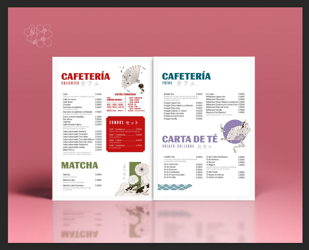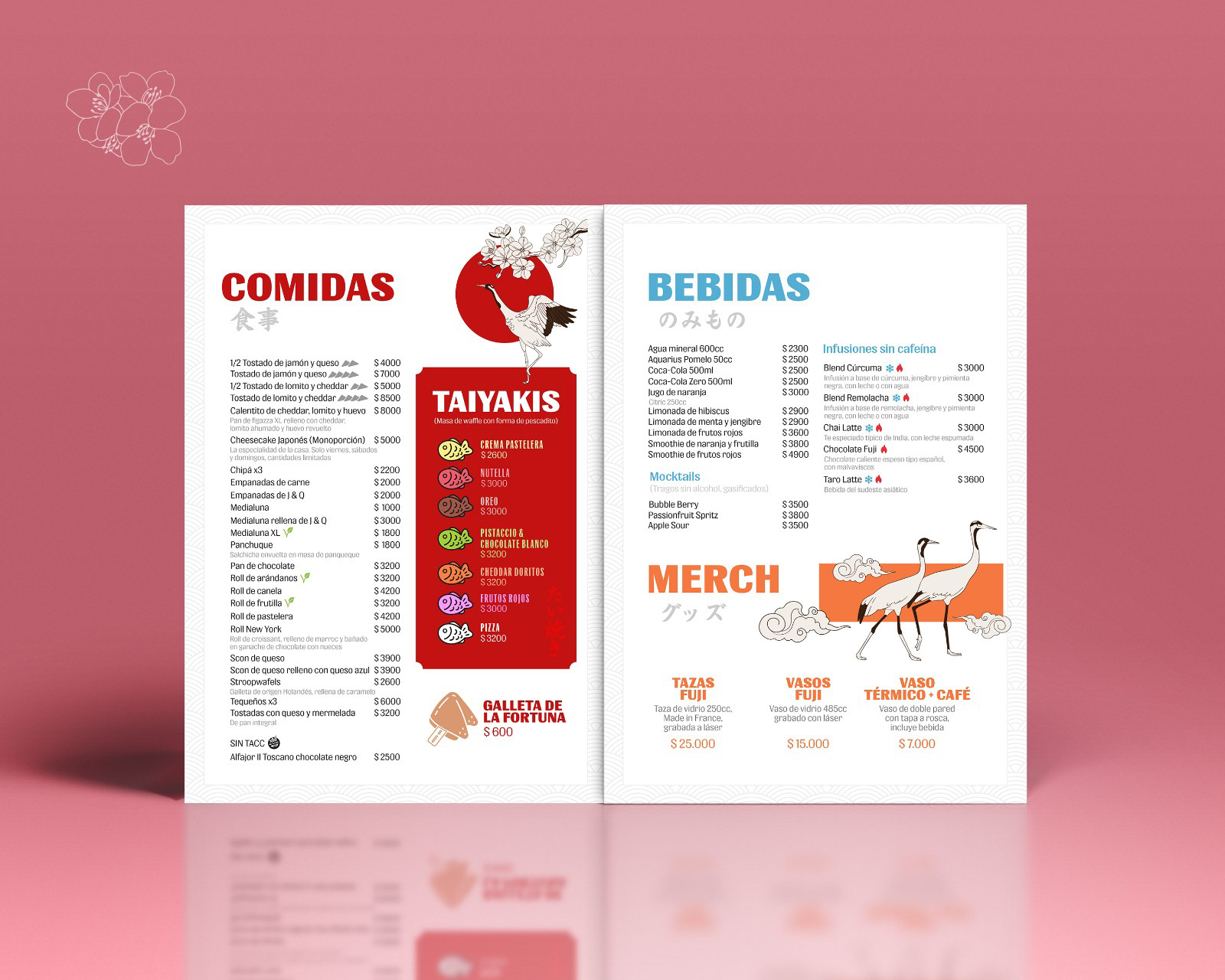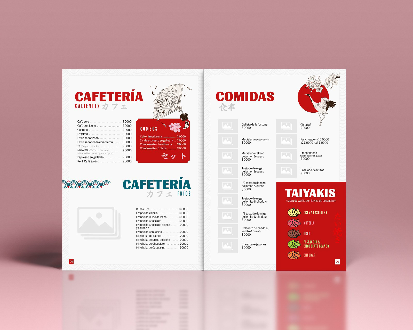 Trabajamos en una estructura clara y una tipografía que evocara la caligrafía japonesa sin perder modernidad. Cada sección del menú – desde la cafetería caliente y fría hasta las comidas, bebidas y los irresistibles Taiyakis – fue pensada para una navegación intuitiva, permitiendo que las imágenes de los productos respiraran y el texto fuera fácil de leer.